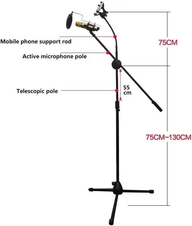 Adjustable Height: Easily adjust the microphone stand from 75cm to 130cm with the telescopic tripod design, perfect for both floor and desktop use.