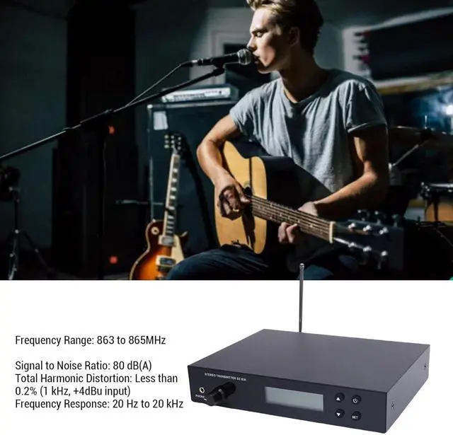 Wide Frequency Support: This wireless IEM system operates in the 863 to 865MHz range, ensuring a total harmonic distortion of less than 0.2% (1 kHz, +4dBu input) with a range of approximately 50 meters indoors.
