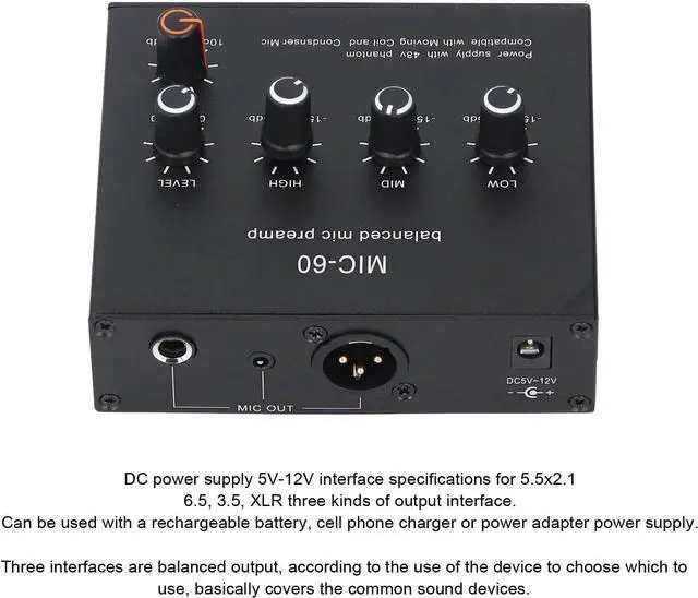 POWER SUPPLY FLEXIBILITY: This microphone preamp uses a DC 5 to 12V power interface, supporting multiple power types. It can be powered by a mobile power bank or charger and includes built-in 48V phantom power to support condenser microphones, suitable for portable or studio use scenarios.