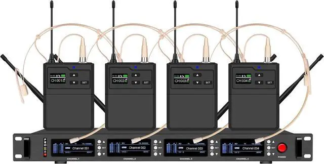 4x100 Adjustable Channels UHF True Diversity Wireless Cordless Headset Headworn Microphone Mic System, Bodypack with Mute, Range 450ft (4 Condenser Head Mics)