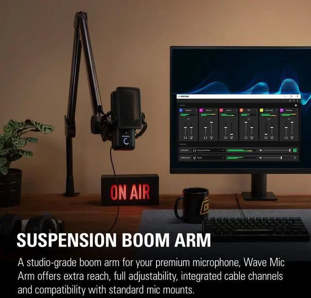A studio-grade boom arm for your premium microphone, Wave Mic Arm offers extreme vertical reach to overcome large monitors and full adjustability for precise microphone positioning. Internals springs and integrated cable channels with removable covers keep your setup tidy and accessible, while thread adapters ensure compatibility with standard mic mounts. In the Box Wave Mic Arm Riser extension Counterweight 1/4" to 3/8" and 1/4" to 5/8" Adaptors Allen Wrench Quick Start Guide Technical Specifications Horizontal reach: 780 mm / 30.7 in Vertical reach: 750 mm / 29.5 in (without riser) Riser extension: 150 mm / 5.9 in Lower arm length: 400 mm / 15.7 in Upper arm length: 400 mm / 15.7 in Desk clamp: expandable up to 60 mm / 2.4 in Counterweight: 260 g / 0.57 lbs Mic weight range: 250 - 1,000 g / 0.55 - 2.2 lbs (with accessories)