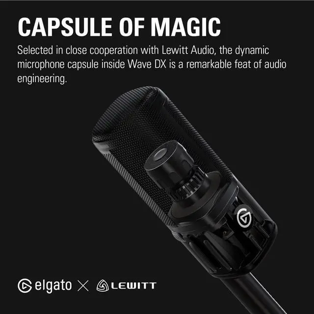 A dynamic cardioid microphone that picks up detail like a condenser, Wave DX captures luscious highs and accurate lows while rejecting room noise. Its hard to find a mic that can do both. Connect any audio interface, no signal booster necessary. Broadcast-ready right out of the box. Technical Specifications Capsule: Dynamic Polar Pattern: Cardioide Frequency Response: 50 - 15000 Hz Sensitivity: 2.5 mV/Pa, -52 dbV/Pa Impedance: 600 Ohm Connector: 3-pin XLR Dimensions: 53 x 53 x 146 mm | 2.1 x 2.1 x 5.7 in Weight: 440 g | 1 lb Mounting: 1/4", 3/8", 5/8" Requirements XLR Audio Interface XLR Cable (3-pin) Mic Stand, Boom Arm, or Similar Works Great With Elgato Wave XLR Elgato Wave Mic Arm / LP.