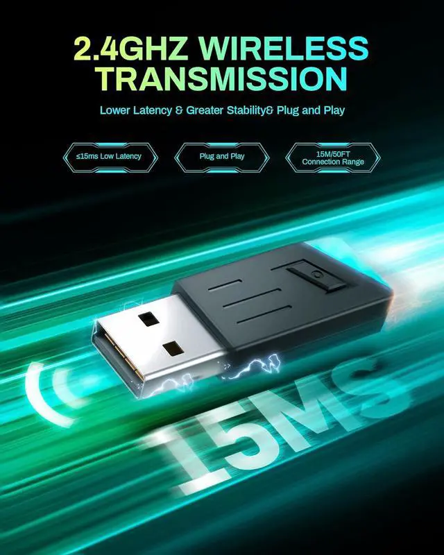 Equipped with advanced 2.4G hz wireless technology and Bluetooth 5.4, UG-06 gaming headset ensures a seamless and stable connection for uninterrupted gaming sessions. With an ultra-low latency of 15ms, you can enjoy lightning-fast response times and immerse yourself in the game as never before without the hassle of tangled wires. (Note: To switch Bluetooth to 2.4G dongle mode, click the power button three times)