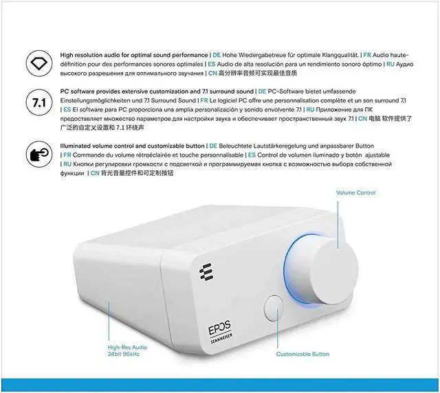 Designed for the gamer seeking enhanced performance with their gaming headset, the GSX 300 external sound card boosts your audio experience to new levels^^>A simple to use, well-engineered addition to your gamer arsenal, instead of relying on your PC on-board sound, this is the must-have audio upgrade for your gaming setup^^>The proprietary EPOS Gaming Suite for Windows 10 adds audio refinement controls, customization of 7.1 surround sound and digital noise cancellation to your game^^>A volume dial allows quick, easy control while gaming and a smart button toggles between surround and stereo sound or between profile presets^^>Enjoy enhanced game audio and crisp team communication with this excellent value-for-money, external sound card and let the Power of Audio take you to new dimensions.