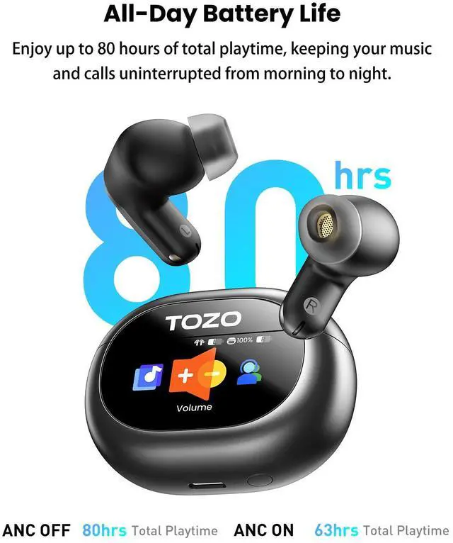 [Custom EQ] Personalize your sound via the TOZO app. Create custom 32 EQ settings, adjust noise control, and spatial audio effects. Share your unique sound profiles with friends for a tailored audio experience.