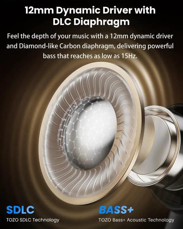 [SDLC Super DLC Acoustic Technology] The earbuds features a custom 12mm driver with a Super DLC diaphragm for exceptionally clear highs and dual magnets for rich, distortion-free bassdelivering a detailed yet relaxing listening experience that lasts for hours.