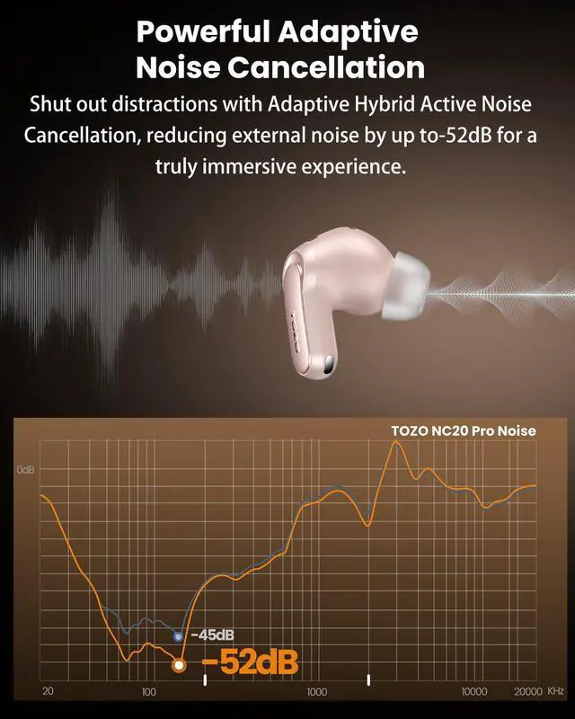 [Flagship Sound with Hi-Res Audio Wireless & LDAC] The TOZO NC20 earbuds support Hi-Res Audio wireless with LDAC, transmitting 3x more data than standard bluetooth for stunning detail. While OrigX Pro technology and a wide 12Hz-40kHz range create a remarkably immersive soundscape with a powerful sense of space.