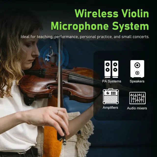 6 Hours Continuous Use TimeThe violin mic transmitter and receiver equipped with a built-in rechargeable battery, offers 6 hours of continuous use after a 2.5 to 3-hour charge. Included in the package is a 2-in-1 charging cable for simultaneously charging both the transmitter and receiver. Ideal for gigs, weddings, church, teaching, band performances, pub shows, personal musician performances, and small concerts.