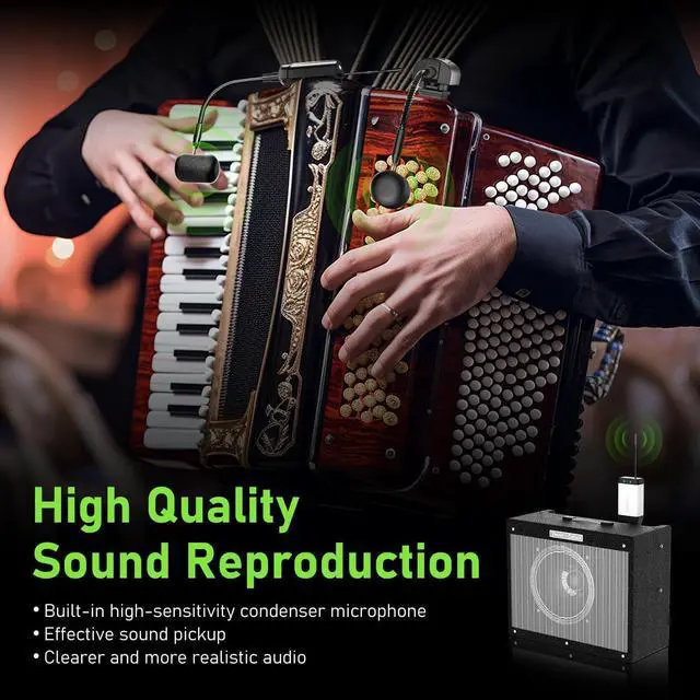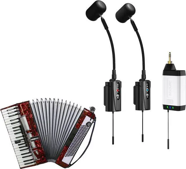2 Transmitters with 1 ReceiverThe dual transmitter system captures sound from the accordion simultaneously, enhancing clarity and sound quality. Specifically designed for the accordion, this system uses two microphone transmitters to pick up sound from all directions.