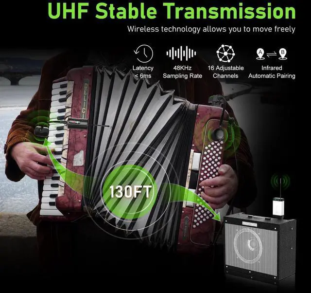 UHF Stable TransmissionThe wireless Accordion microphone system utilizes UHF frequency and advanced digital audio transmission technology, featuring infrared automatic pairing, a 48kHz sampling rate, and an ultra-short audio delay. This ensures recording-quality sound transmission. The system offers stable transmission up to 132ft (40 meters) in open areas. (Note: Please ensure the antenna on the bottom of the receiver is installed before formal use.)