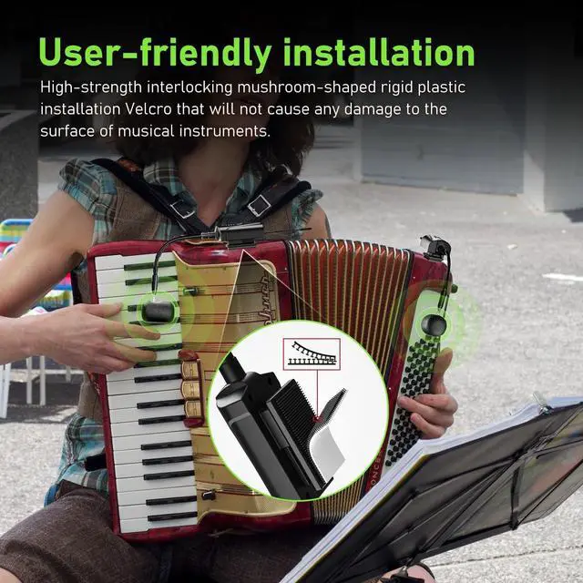 Lightweight Flexible Gooseneck DesignPress the Velcro of the transmitter onto the Velcro with adhesive film. Tear off the adhesive film of the Velcro. Stick the transmitters near the keyboard and bass voice changers respectively. Adjust the gooseneck so that the microphones are aligned with the sound parts of the accordion and keep a moderate distance. The flexible gooseneck is meticulously crafted from high-quality materials, providing both stability and effortless adjustability.