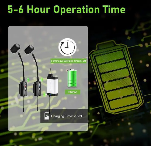 6 Hours Continuous Use Time The 2 transmitters and 1 receiver are equipped with built-in rechargeable batteries, offering 6 hours of continuous use on a single charge after a 2.5 to 3 hours charging time. Included in the package is a 2-in-1 charging cable for simultaneously charging both the transmitter and receiver. Ideal for gigs, weddings, church services, teaching, band performances, pub performances, solo musician performances, and small concerts.