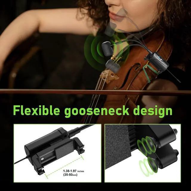 Lightweight Gooseneck Adjustable Clip-On DesignThe Q2/VT-5 wireless violin microphone transmitter comes with a silicone-coated spring clip that securely attaches to the violin's side, ensuring a firm and steady grip without causing any damage. The flexible gooseneck design, crafted from premium materials, offers both stability and effortless adjustability, eliminating any undesired rebound. The transmitter is lightweight, weighing only 2.4 ounces.