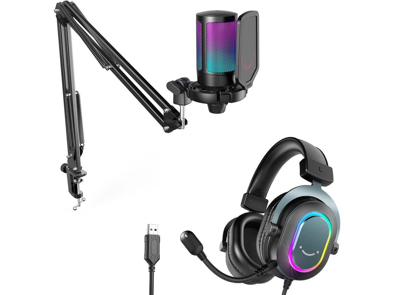 FIFINE Gaming Microphone and USB Streaming Headset Kit, PC Podcast Condenser Mic with Boom Arm, Pop Filter, Mute, Wired Headphones with 7.1 Surround Sound, for Streaming, Twitch, Online Chat