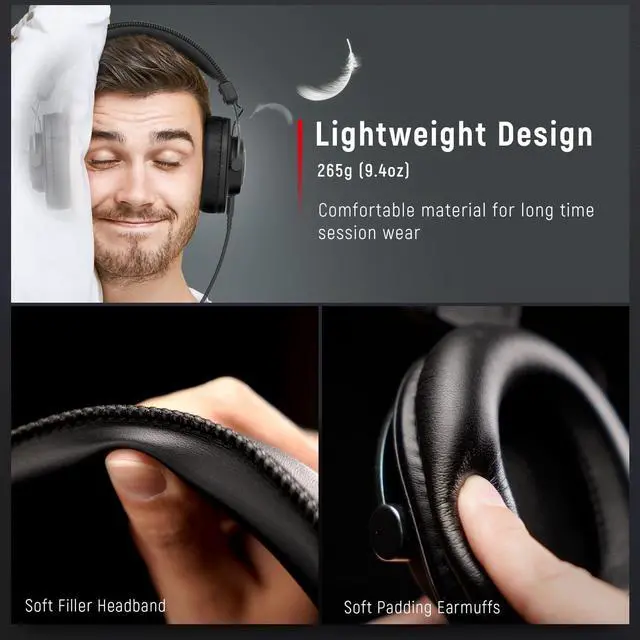 [Comfortable Material] The headband and earmuffs contained soft padding make you work with comfortable feeling while podcast or voiceover. Weight of 265g and lightweight design, the recording headphones, audio monitors, can reduce your feeling about heavy. Your ears and head still feel soft and satisfied, even when long session work with the mixing headphones.