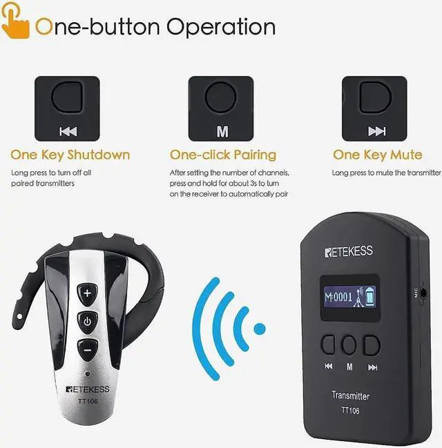 Retekess TT106 Tour guide allows to turn off all the receivers paired with the transmitter within 5 seconds, this can save you a lot of time and improve your work efficiency
