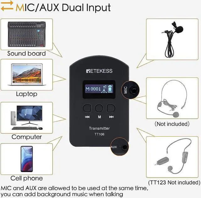 Digital signal transmission; longer distance with high confidentiality; stable and clear audio quality widely used for church; simultaneous interpretation; seminars; exhibitions; art galleries and other learning activities; special job training; the transmitter has MIC input for microphone and supports mono channel external AUX audio input like MP3 or smart phone