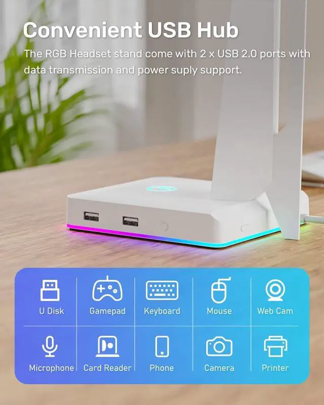Convenient USB HubThe headset stand comes with 2 x USB 2.0 Ports with data transmission & power supply supported. Plug and Play, Offers Easy access your USB Devices, like Mouse, Phone, Gamepad, Microphone No driver needed.