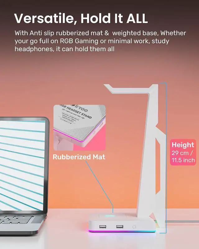 The Home for Your HeadphoneRGB Headset Stand helps your create a clean and sleek desk setup. Store and Organize your headphone, Make sure it is always within reach. Elevate your headphone and protect it from daily scratching.