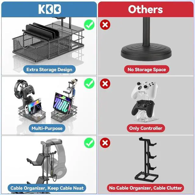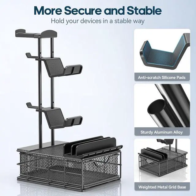 Versatile Compatibility - Our headphone holder compatible with various headsets and controllers. It can hold two game controllers and one headset simultaneously. The groove can also hold a smartphone, I-pad, or Switch. All-in-one storage provides the ideal solution for your space and desktop.