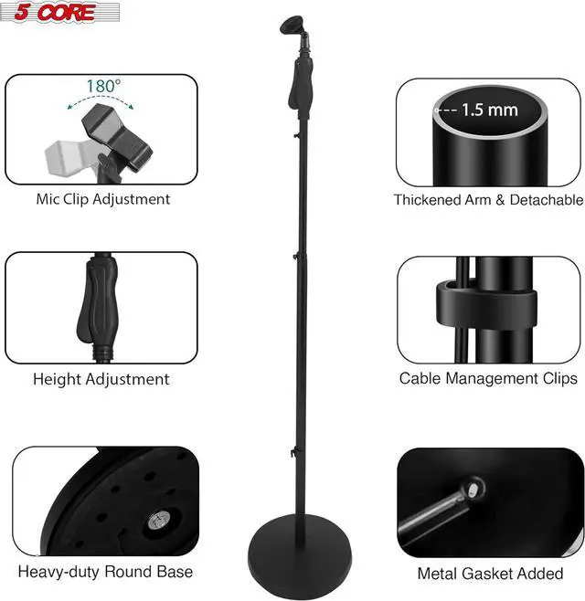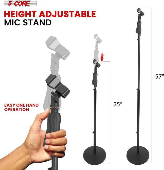 Adjustable Height Floor Mic Stand Customize your setup effortlessly with a quick-release clutch system. This floor-standing microphone stand adjusts smoothly from 35 to 57 inches, making it perfect for vocalists, speakers, and performers of all heights.