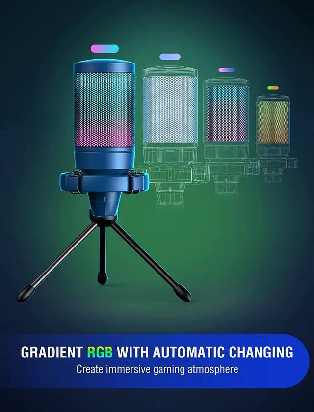 Vivid RGB & Quick Mute-Polished blue mic body with automatic changing RGB, matching flowing rainbow light computer build, shows your calm and luxury of gamer device. Touch the mute button on the top to quickly mute, and the RGB will be turned off following it, reminding you of working status.
