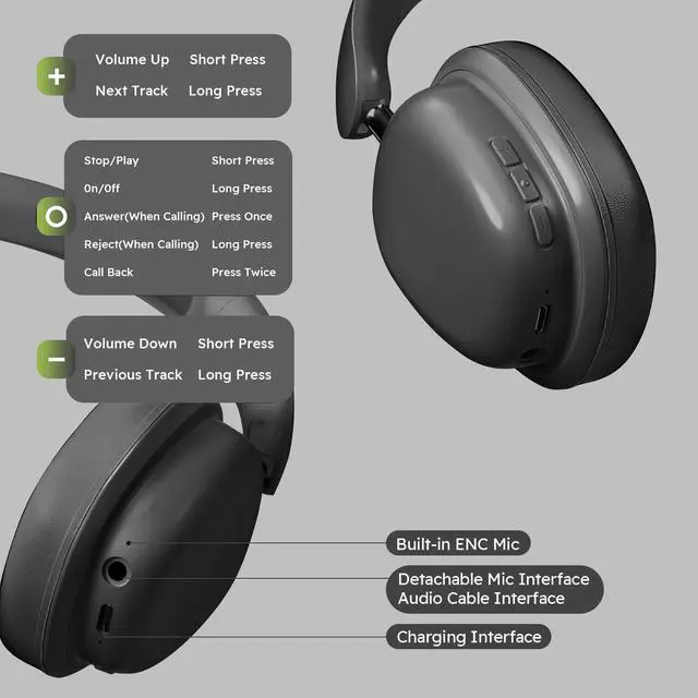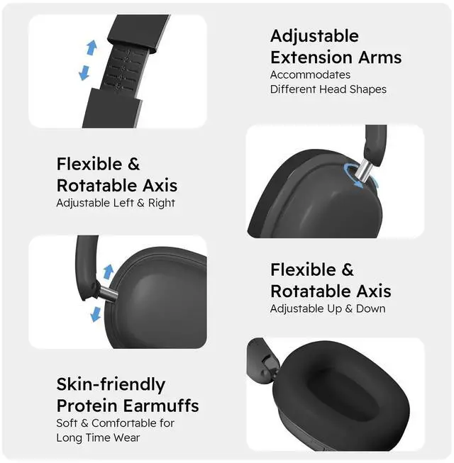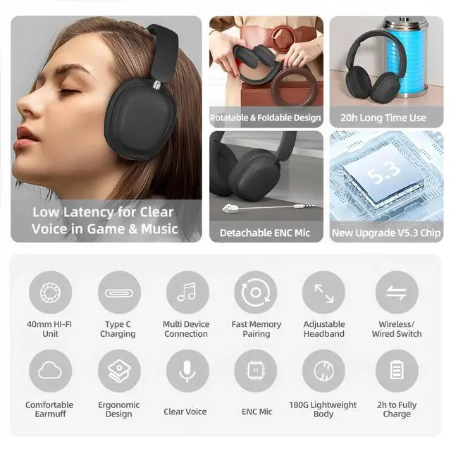 FOLDABLE AND ROTATABLEThis headset combines ergonomic design, you will feel comfortable and stress-free when you put it on. With foldable and rotatable design, it is more convenient to store and carry. It is also free to stretch to adjust the size, which can fit different head shapes.