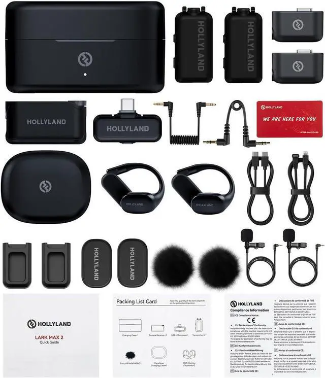 INCLUDED - 2x Transmitters, Camera Receiver, USB-C Receiver, Charging Case, 2x Furry Windshields, USB-C to Lightning Cable, 3.5mm TRS to 3.5mm TRS Cable, USB-C to USB-C Cable, 2x OWS Monitor Earphones, Earphone Charging Case, 2x Omnidirectional Lavalier Microphones, 2x USB-C to 3.5mm Adapters, 2x Ma