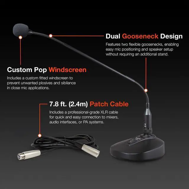Features two goosenecks between the microphone and its stand, allowing users to move the mic around freely and position it as needed