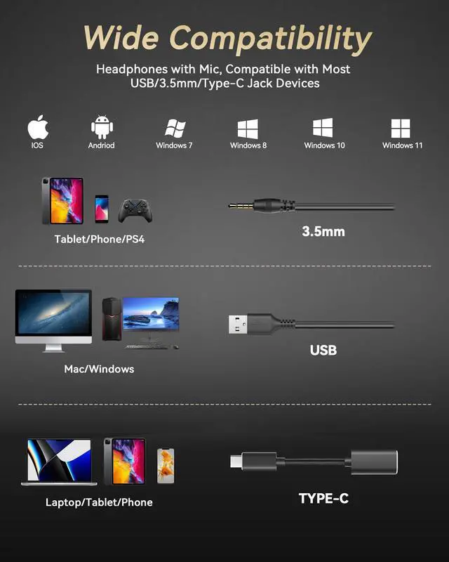 - Via 3.5MM, USB-A, USB-C connectivity, works with computers, laptops, mac, phones.