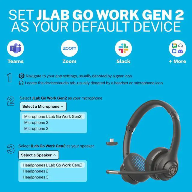 The Go Work Gen 2 Headset works with platforms like Zoom and Teams. After connecting, you may need to select it as your speaker and microphone in the software, depending on your device and platform.