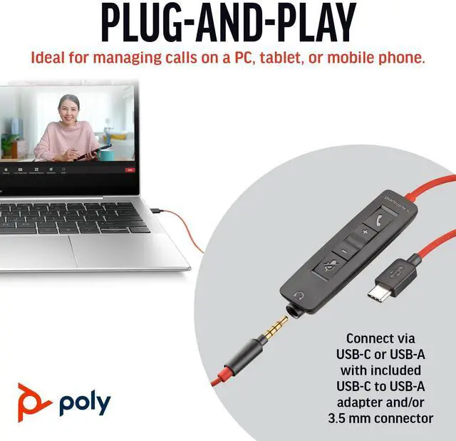 CONNECTIVITY MADE SIMPLE. Easily manage calls with these work headphones on your PC, mobile device, or tablet with the USB-C cord, tethered USB-A adapter, or 3.5mm jack for mobile. Reliable, plug-and-play connectivity across devices in any environment