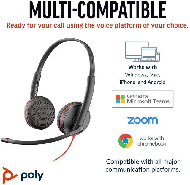 COMFORT THAT LASTS ALL DAY. Work your way with comfort and flexibility with the HP Poly Blackwire 3225; a sleek, durable USB headset with microphone for PC, featuring a flexible noise-canceling mic and lightweight design for secure personalized fit