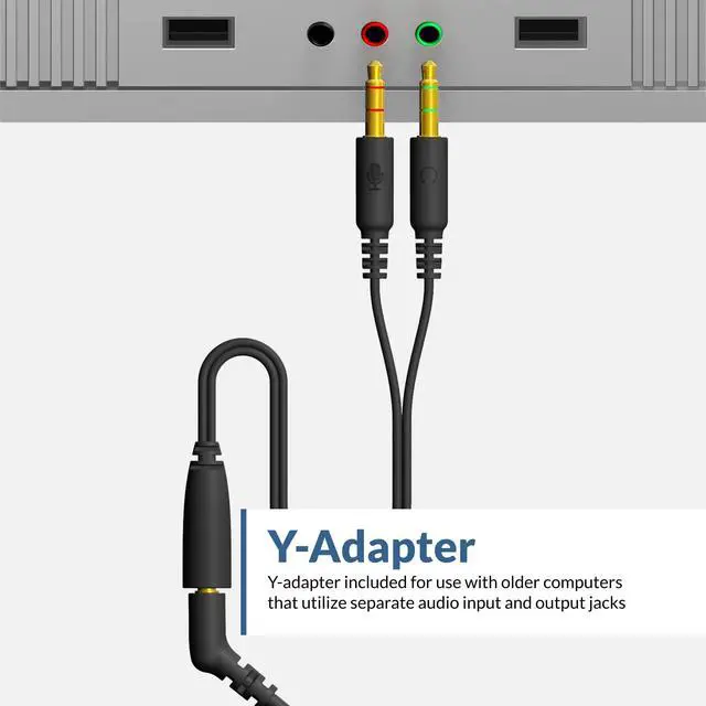 The Y-adaptor is for computers with a split audio output and microphone input.