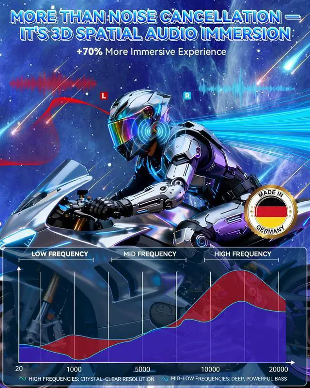 German 3D Stereo Sound TechnologyAdopts precise dual-channel separation design, increasing immersive experience by 70%. Compared with non-stereo alternatives, it provides better spatial awareness, allowing riders to enjoy a more immersive auditory experience while ensuring safety.