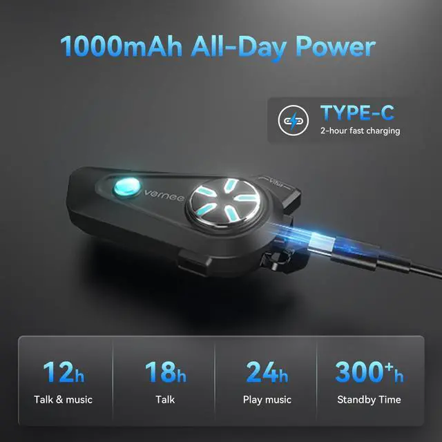 1000MAH Battery & IP67 Waterproof:The Vernee helmet bluetooth headset With its high-capacity 1000mAh battery, there is no need for frequent charging. In just 2 hours, it can provide you with up to 18 hours of intercom and call experience. Besides, the Vernee Motorcycle Bluetooth features a IP67 Waterproof design, with each component carefully sealed to effectively resist water ingress during your ride