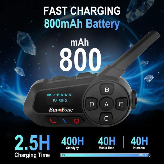 800mAh Battery & Music SharingThis motorcycle bluetooth helmet speakers has a battery capacity of 800 mAh and charges using the TYPE-C interface, allowing for a rapid full charge in just 2.5 hours. Once fully charged, it can last up to 600h on standby, 32h for listening to music, and 50h for continuous calling.It also featured music sharing,allowing two riders to share the joy of the same song during their trip
