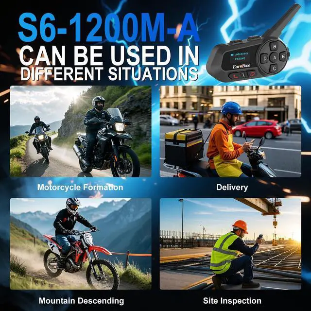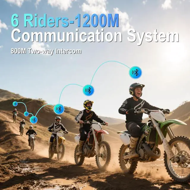 2-Rider Intercom System S6-1200-A motorcycle bluetooth headset supports pairing of 6 people but only 2 riders can talk to each other (the host can choose any one of the 5 people). The distance can reach 1200M between 2 people, within the effective distance, the sound is clear and stable, and S6-1200-A motorcycle intercom can communicate well with partner.