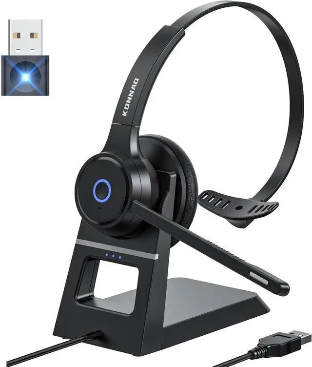Bluetooth Headset with AI Noise Cancelling Microphone, V 5.3 Wireless Headphones with USB Dongle, Charging Station, Microphone Mute Switch, Wireless Headsets for Work