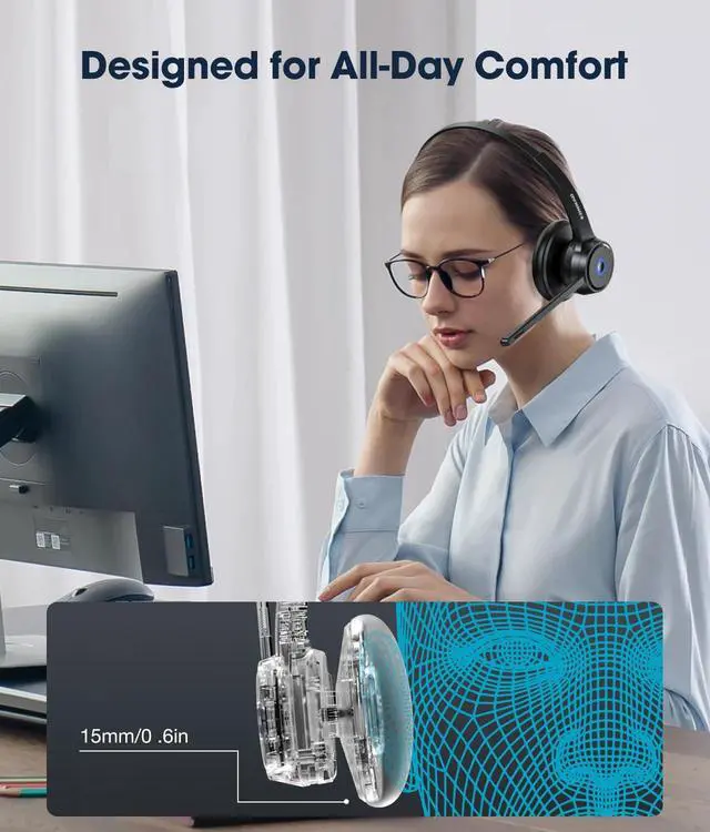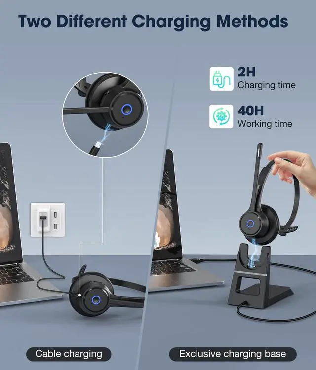 40-Hour Battery & Dual Charging Options: Never worry about power during your workday. This Bluetooth headset for work is equipped with a long-lasting battery that provides up to 40 hours of continuous talk time on a single 2-hour charge. It supports two convenient charging methods: use the dedicated charging base for a clutter-free desk or the USB-C cable for fast, on-the-go charging.