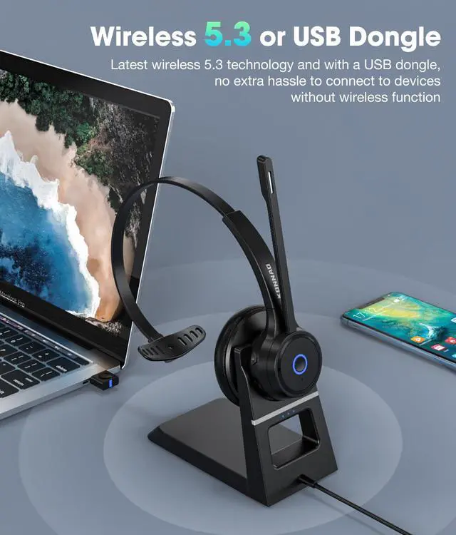 Dual-Mode Connectivity: Bluetooth 5.3 & Plug-and-Play USB: Enjoy unparalleled flexibility and stability. This wireless headset for work features the latest Bluetooth 5.3 for faster pairing, a more stable connection, and lower latency with compatible devices. For computers without Bluetooth, simply use the included USB-C adapter for instant plug-and-play connectivity. This office headset with mic ensures seamless compatibility with PCs, laptops, and mobile phones.