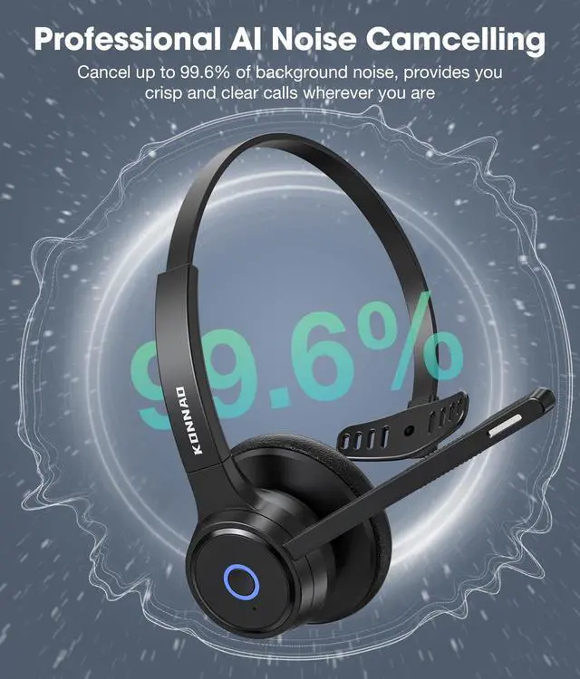 AI Noise Cancellation: Experience professional-grade audio with the KONNAO wireless headset with microphone for work. Our advanced AI noise-canceling technology effectively eliminates 99.6% of ambient noise, ensuring your voice is transmitted with absolute clarity in busy offices or home environments. This Bluetooth headset with microphone delivers immersive high-fidelity sound,Suitable for use in scenarios such as conference calls, online training sessions, and call centres.