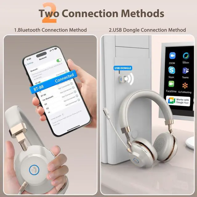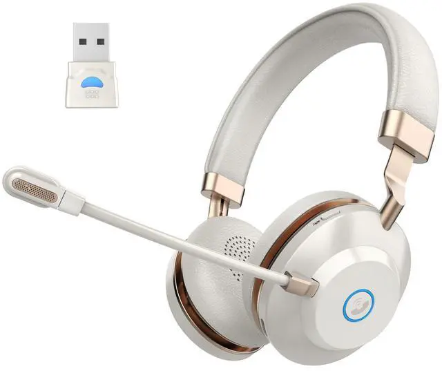 Our wireless headset for work are on-ear headphones. They feature soft memory foam ear cushions, adjustable headband, a 270°rotatable microphone, and a flexible microphone arm to meet your comfort needs throughout the day.