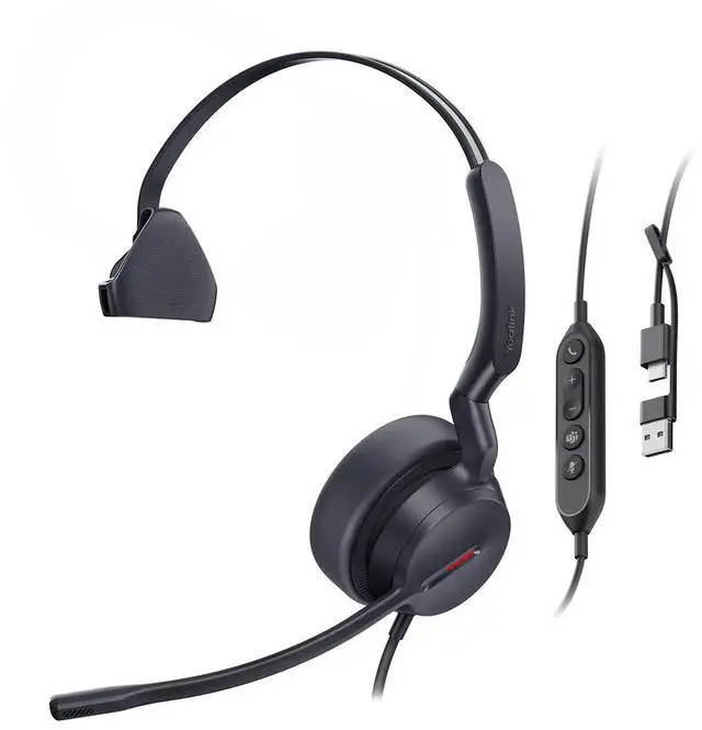 Yealink UH44 Teams Certified USB Headset - Noise Cancelling Mic, Single-Ear Design with Pivotable Boom, Monaural Audio for PC/Laptop with Inline Controls, USB-C/A & Busylight