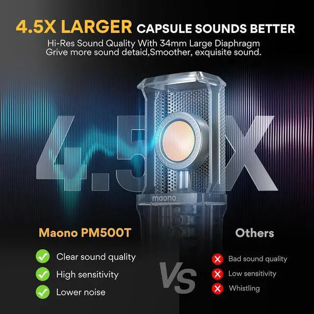 Studio Grade Sound: The PM500 XLR condenser microphone features a custom-designed 34 mm large diaphragm gold condenser capsule and offers a dynamic range of 20Hz - 20kHz, low noise, ensures every recording is incredibly clean, high sensitivity and extremely high SPL handling that you will no trouble recording loud sound sources, from guitar cabinets to drums. The XLR mic optimised for Professional music creation, instrument singing, vocal, podcast recording with detailed, full and warm sound