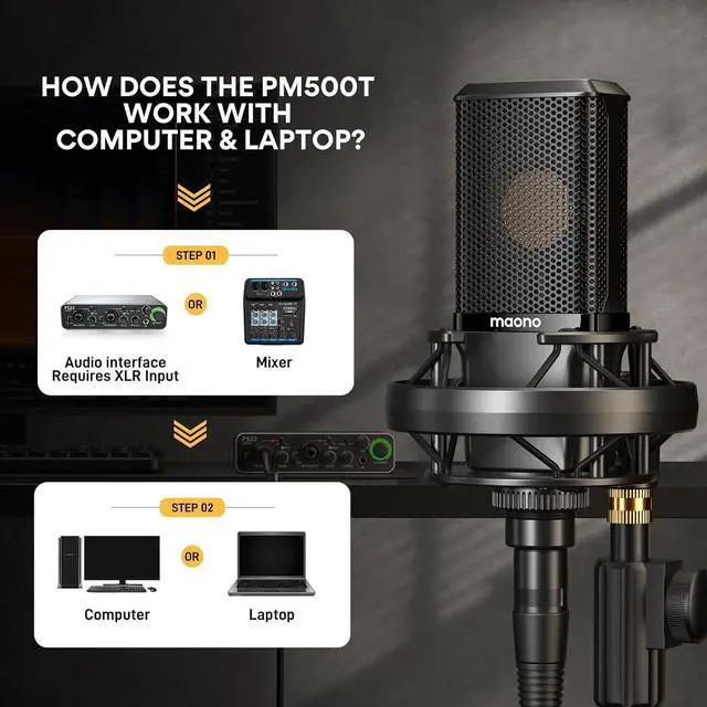 External Power Source Required: The PM500 Vocal condenser microphone with premium XLR cable for plugging into an audio mixer, 48V phantom power or interface, so you can get recording right away. the studio microphone with good shielding and balanced output for a more clear, rich and stable sound, makes the podcast audio immersive. If you want to connect the XLR condenser microphone to the Windows laptop/iOS/PAD/mobile phone, please make sure you have your Phantom Power ready