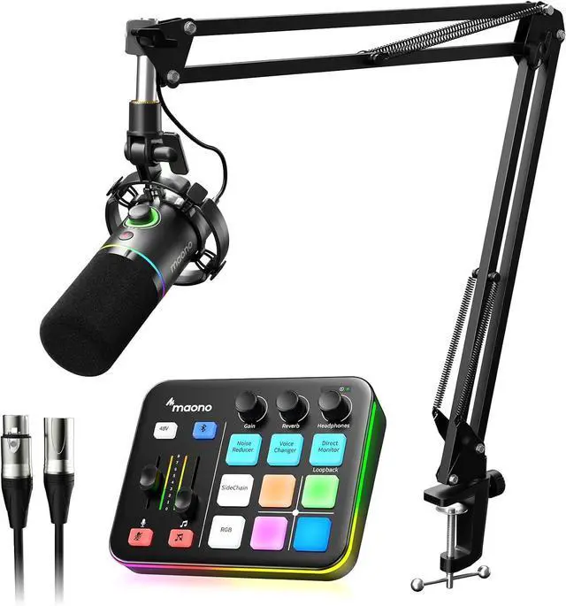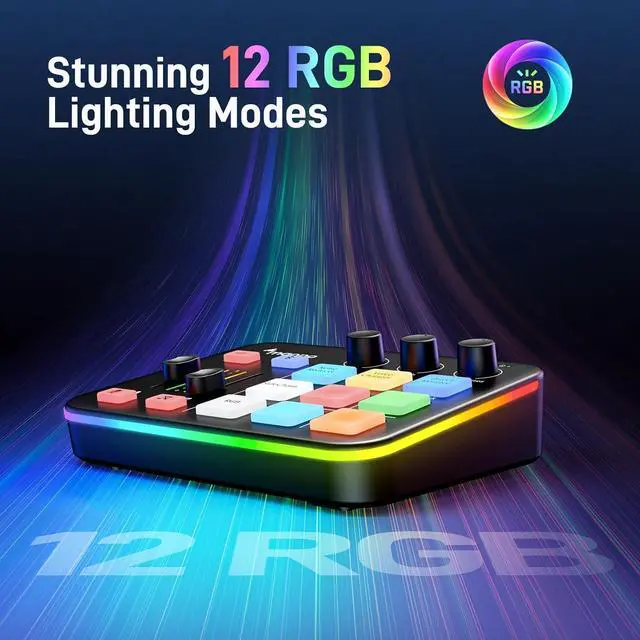 1XLR Input22-Level Noise Reduction3Microphone Gain&Volume448V Phantom Power5Enhance your voice1Charming RGB2Voice Changes34 Customizable Soundpads4One-Key Mute5Bluetooth Audio Input1For Gaming Chat2For Gaming Streaming3For Content Creator1LOOPBACK2Direct Monitor3Great Compatibility4With Headset5Individual Control1For Gaming Chat2Dual PC Streaming3PS4/5 Gaming4Mobie Gaming5Q&A