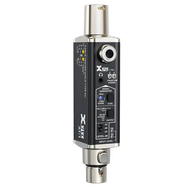 The Xvive AT-1 is a versatile audio tester that simplifies troubleshooting for live sound engineers and audio professionals. It integrates a signal generator, XLR cable tester, phantom power checker, input level meter, and headphone/speaker monitoring into a compact unit.