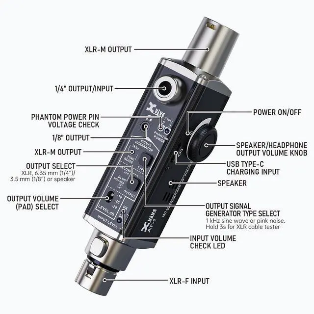 Signal Generator1 kHz sine wave; pinknoiseXLR Cable Tester3 pins of the XLRcableXLR Input MeteringMeasures the input volume levelPhantom Power Checkvoltage: 44-52V / 24-44VHeadphone&Speaker Monitoring1/4 or XLR-F input Xvive AT-1 Portable Audio Tester Overview XLR Cable Tester Essential Tool for Audio Professionals DI Boxs IEM systems PA speakers Phantom Power