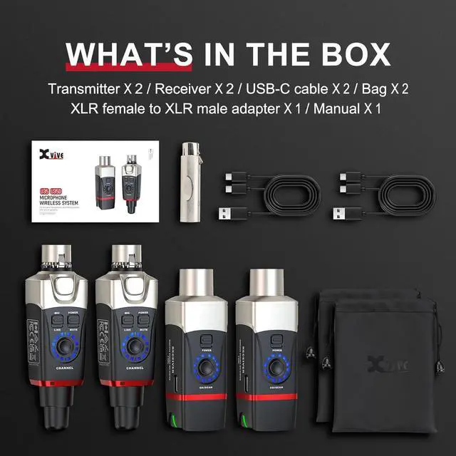 [What You Get] - 1. Xvive U35 Transmitter *2, 2. Xvive U35 Receiver *2, 3. USB Cable *2, 4.Bag *2, 5. XLR Female to XLR Male Adapter *1
